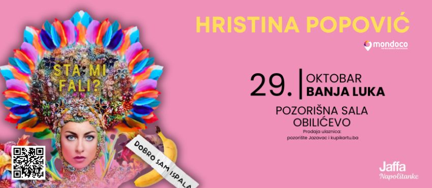 By clicking on the Buy a Ticket button you begin the process of purchasing tickets for HRISTINA POPOVIĆ - DOBRO SAM ISPALA - BANJA LUKA 29/10 on 29.10.2025. 20:00 .