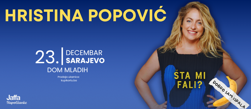 Klikom na link Kupi kartu započinjete proces kupovine karata za HRISTINA POPOVIĆ - DOBRO SAM ISPALA u terminu 23.12.2025. u 20:00 .