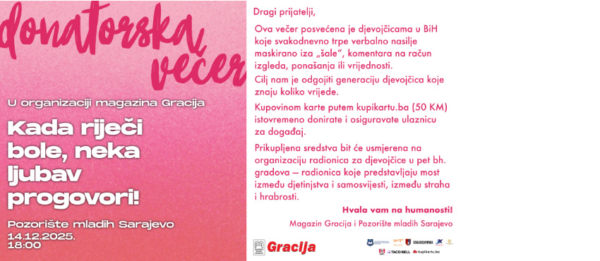 Klikom na link Kupi kartu započinjete proces kupovine karata za Donatorska večer - Kada riječi bole, neka ljubav progovori! u terminu 14.12.2025. u 18:00 .